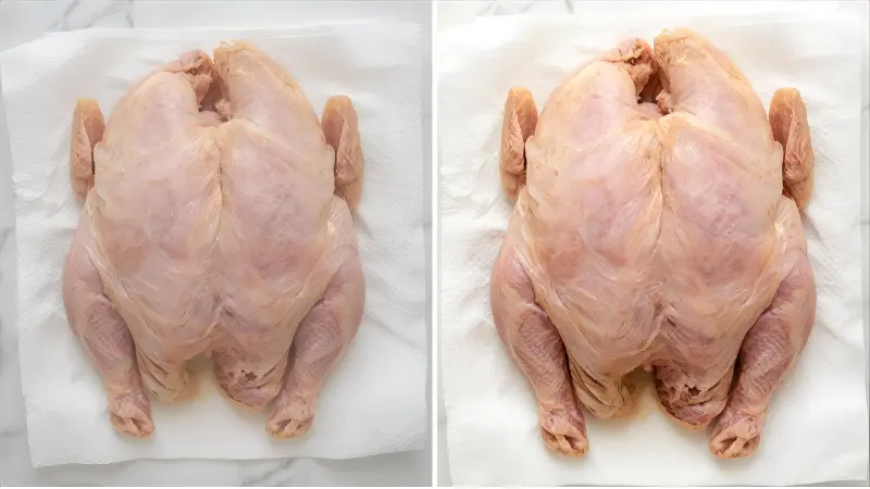 Remove your chicken from the fridge 30 minutes before cooking. Cold chicken = uneven cooking. Remove any giblets from the cavity (check both ends!). Pat the entire chicken dry with paper towels, both inside and out. This step is crucial for crispy skin. Moisture is the enemy of crispiness!