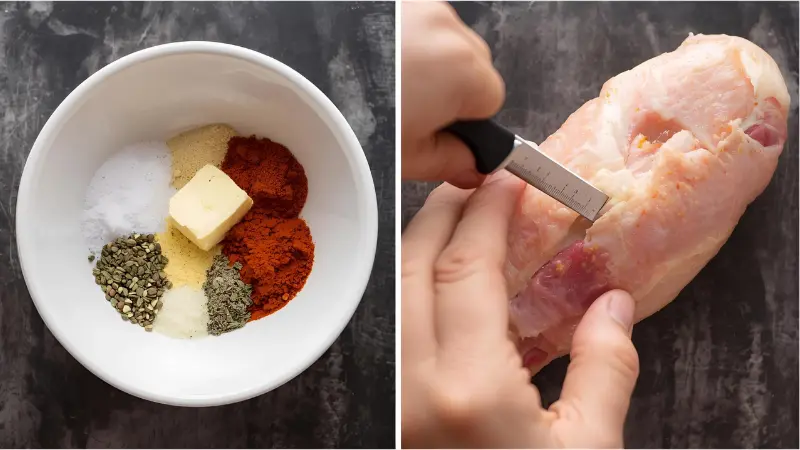 - In a small bowl, mix your softened butter with salt, pepper, garlic powder, paprika, thyme, and rosemary. Now here’s the fun part: gently slide your fingers under the skin of the breast to separate it from the meat. Be careful not to tear it! Spread about half the butter mixture directly on the breast meat under the skin. Rub the remaining butter all over the outside of the chicken. Don’t be shy—get in there!