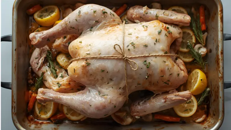 - Stuff the cavity with lemon halves, smashed garlic cloves, and fresh herb sprigs. This creates aromatic steam that flavors the meat from the inside. Tie the legs together with kitchen twine and tuck the wing tips under the body. This helps everything cook evenly.